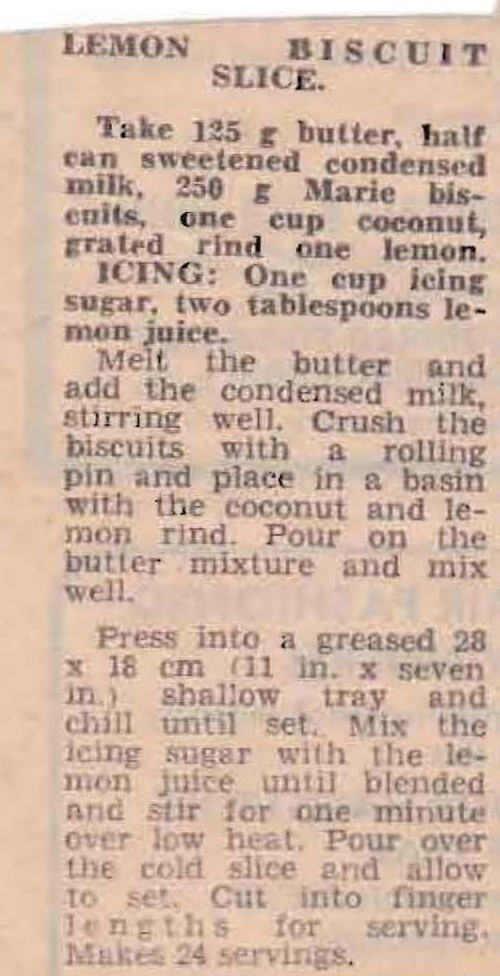 I’ve made this slice many times myself, but I have it in my collection as Wanganui Slice. I’ve always thought that it was named after the New Zealand town of Whanganui. Whatever the name, it tastes good, although it is rather on the sweet side.