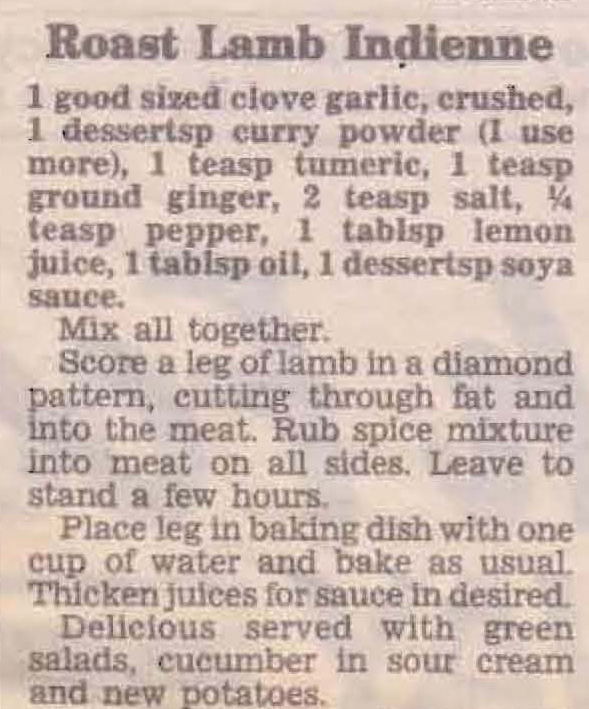 Mum collected this recipe from the Herald Sun back in the ’80s, back then her curries were always made with curry powder. This must have seemed a bit exotic to her – curry rubbed onto the skin of a lamb roast. Her lamb roasts were always baked plain and served with homemade mint sauce and, of course, gravy.