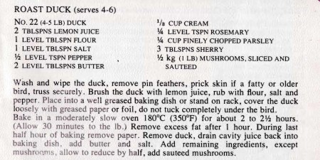To be honest I’m not a lover of duck, but I know I’m in the minority. This 70s recipe comes from a booklet put out by the Australian Wine Board titled ‘Bacchus in the Kitchen’, which paired dishes with wines. The suggestion for this recipe is to serve it with a dry red.