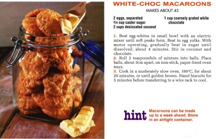 WHITE CHOCOLATE MACAROONS Posted on May 30, 2020 by bebsrecipes Reply Coffee and macaroons…………yum, but just for a change what about trying these macaroons made with white chocolate. The added bonus is that they’re gluten free.