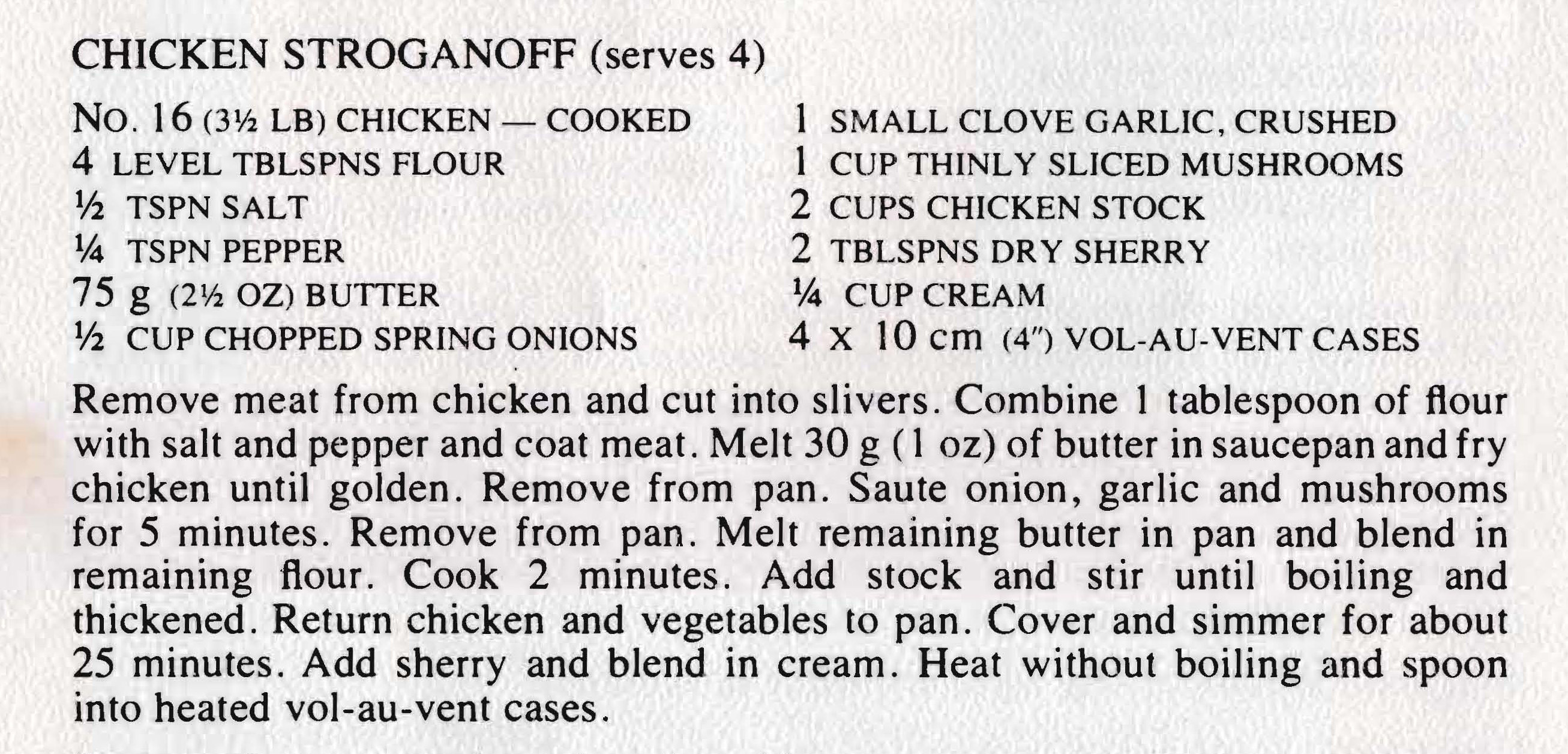 Seems like when Mum tore this out of the Woman’s Day she missed the last few lines so has handwritten them on the bottom. Her instructions read “other half 27cm” and “over with pastry. 200o C, 400oF – 40 mins”. I’ll add my comments – that this could be a hearty pie for vegetarians by simply substituting the bacon for extra vegetables.