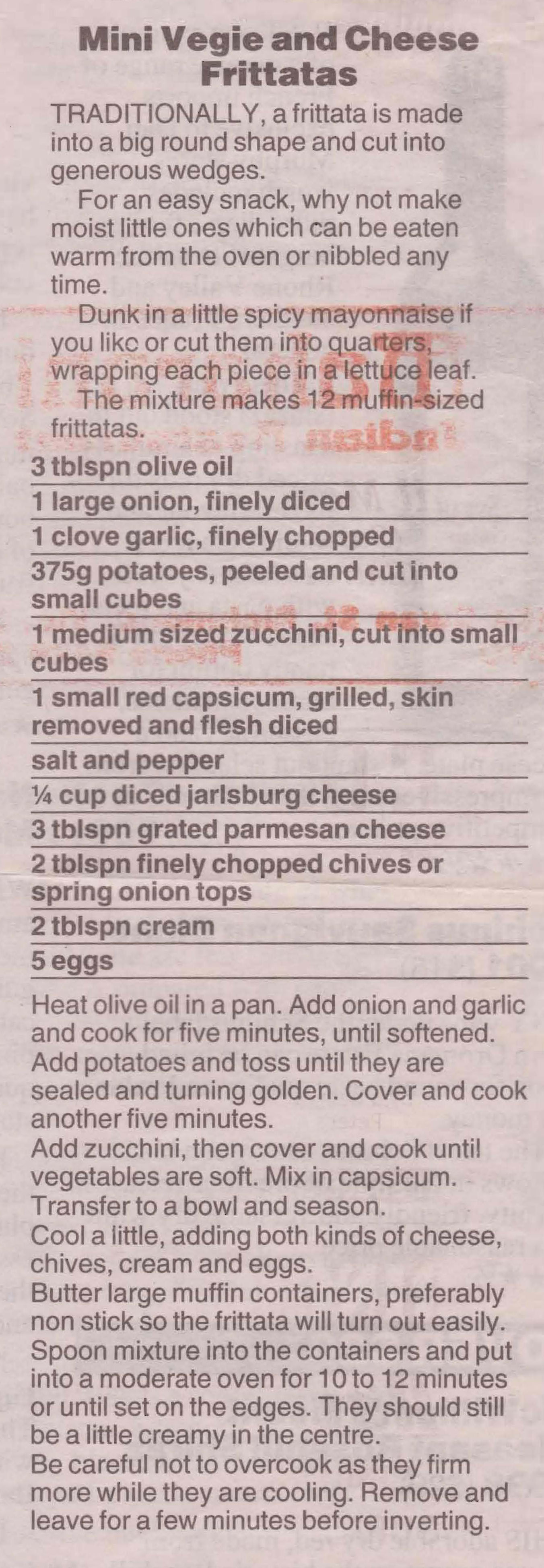 This 1990s Australian Women’s Weekly recipe for a potato omelette slice is a little unusual as it has three ways of cooking the slice, Traditional (baked with cream), Healthy (baked with less eggs, skim milk and low fat cheese) and Microwave (a small variation in the oil and milk quantities). It also gives the kJ and calorie count which is helpful if you’re trying to decide which version to make.
