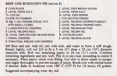 I suppose this pie recipe should now be called Beef and Red Wine Pie, but as this recipe was published back in the ’70s before the labelling laws changed and only wine from the Burgundy region of France could be called that, I think I can leave it as Burgundy. I don’t think it matters too much which grape variety of red wine you use for the recipe, but it should be wine that’s worth drinking and of course a good cook should always sample it before adding it!!!!!!