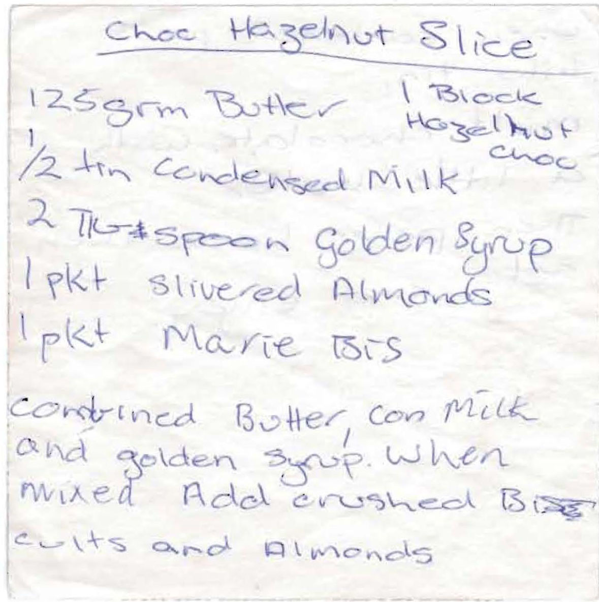 This is a great example of Mum collecting the ingredients and basic cooking method and working the rest out as she went along. The way it’s been written down it looks like the block of Hazelnut Chocolate was almost an afterthought, but it certainly adds to the flavour. When we made it we changed the almond to hazelnuts, but you could make it with plain chocolate and the almonds if you liked, I guess that would make it a Choc Almond Slice though. The verdict the way we made it was Yummm.