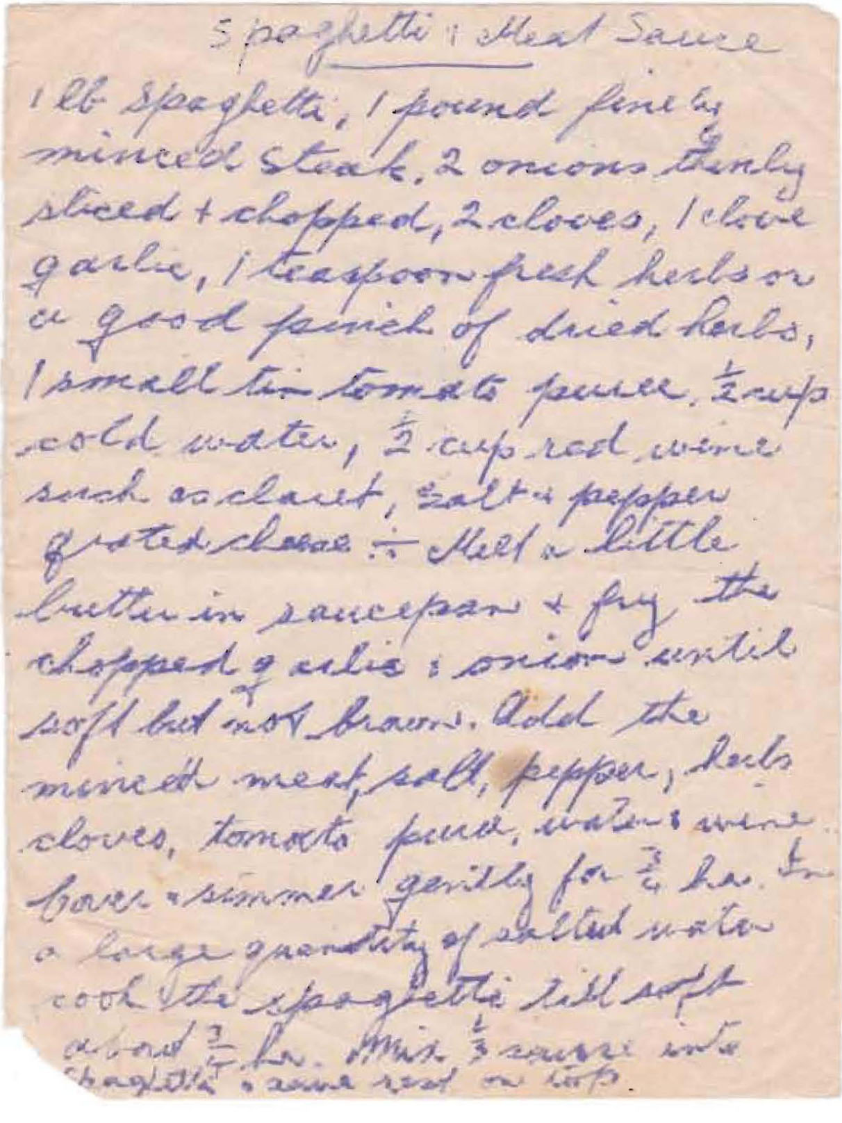 Melt a little butter in a saucepan and fry the chopped garlic and onion until soft but not brown. Add the minced meat, salt, pepper, herbs, cloves, tomato puree, water and wine. Cover and simmer gently for ¾ hour. In a large quantity of salted water cook the spaghetti till soft, about ¾ hour. Drain and place in serving dish. Mix about a third of the sauce into spaghetti and put the rest of the sauce on top. Top with cheese.