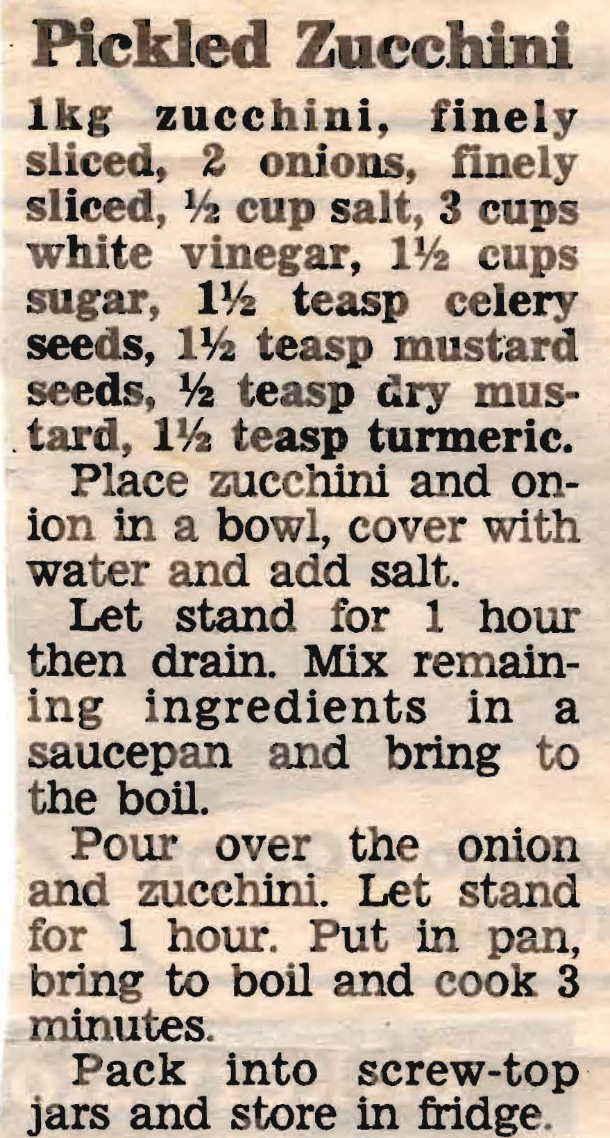 This recipe is for those who have a thriving vegetable patch and at crop of zucchinis about to ripen – every summer back in the 70s that was certainly the case. Although I’m not sure it is now. Back then there were plenty of slice and cake recipes to use them up and pickling them to serve with salads was another idea. If you haven’t got the homegrown variety this recipe only uses a kilogram so it wouldn’t be too expensive to buy them.