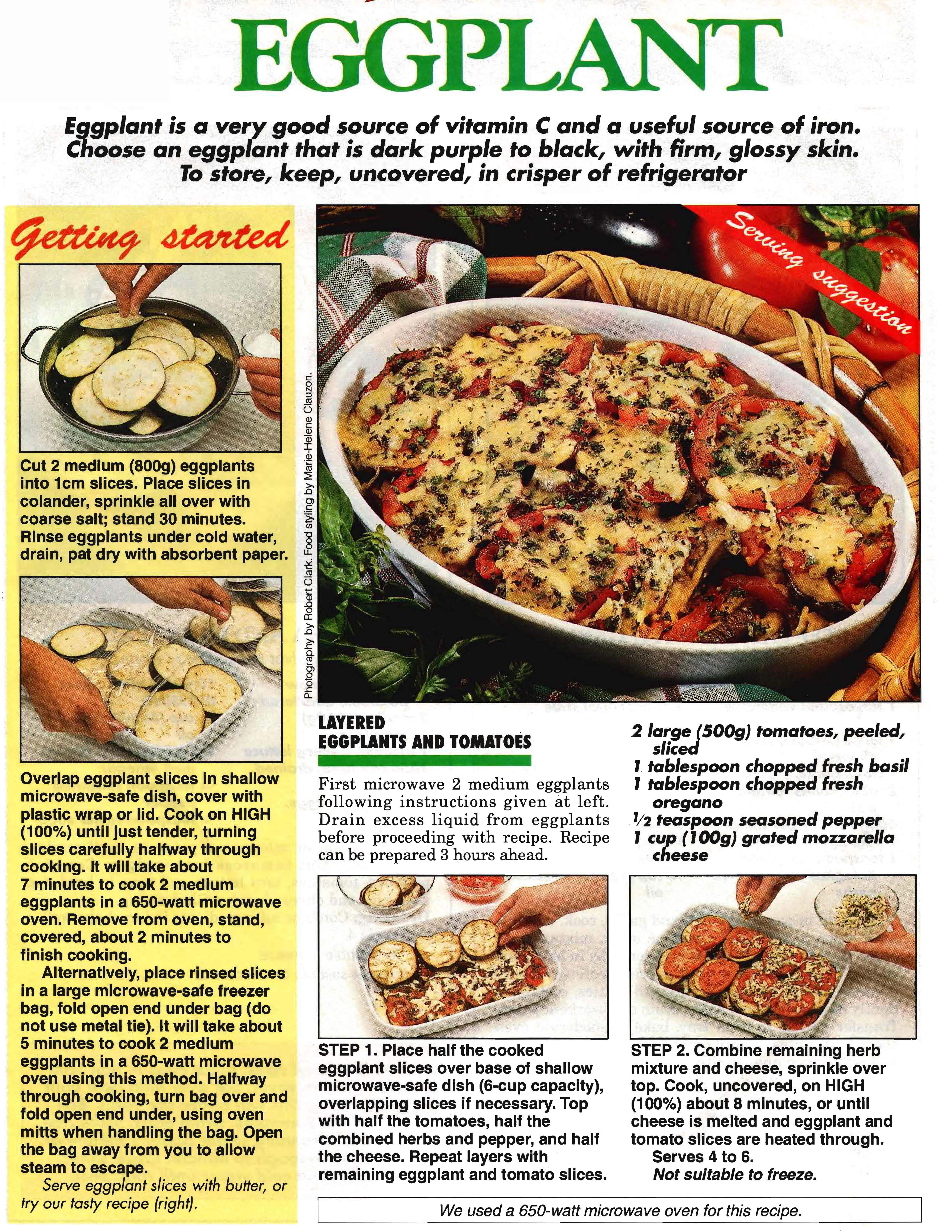 This 1990s recipe comes from a collection printed by The Australian Women’s Weekly – Delicious Vegetables from the Microwave. Two things give its age away. One, it mentions the wattage of the microwave something you don’t see in recipes now and two, it shows you how to salt and drain the eggplants, which you now longer need to do. Despite those things it’still a nice easy vegetable dish.