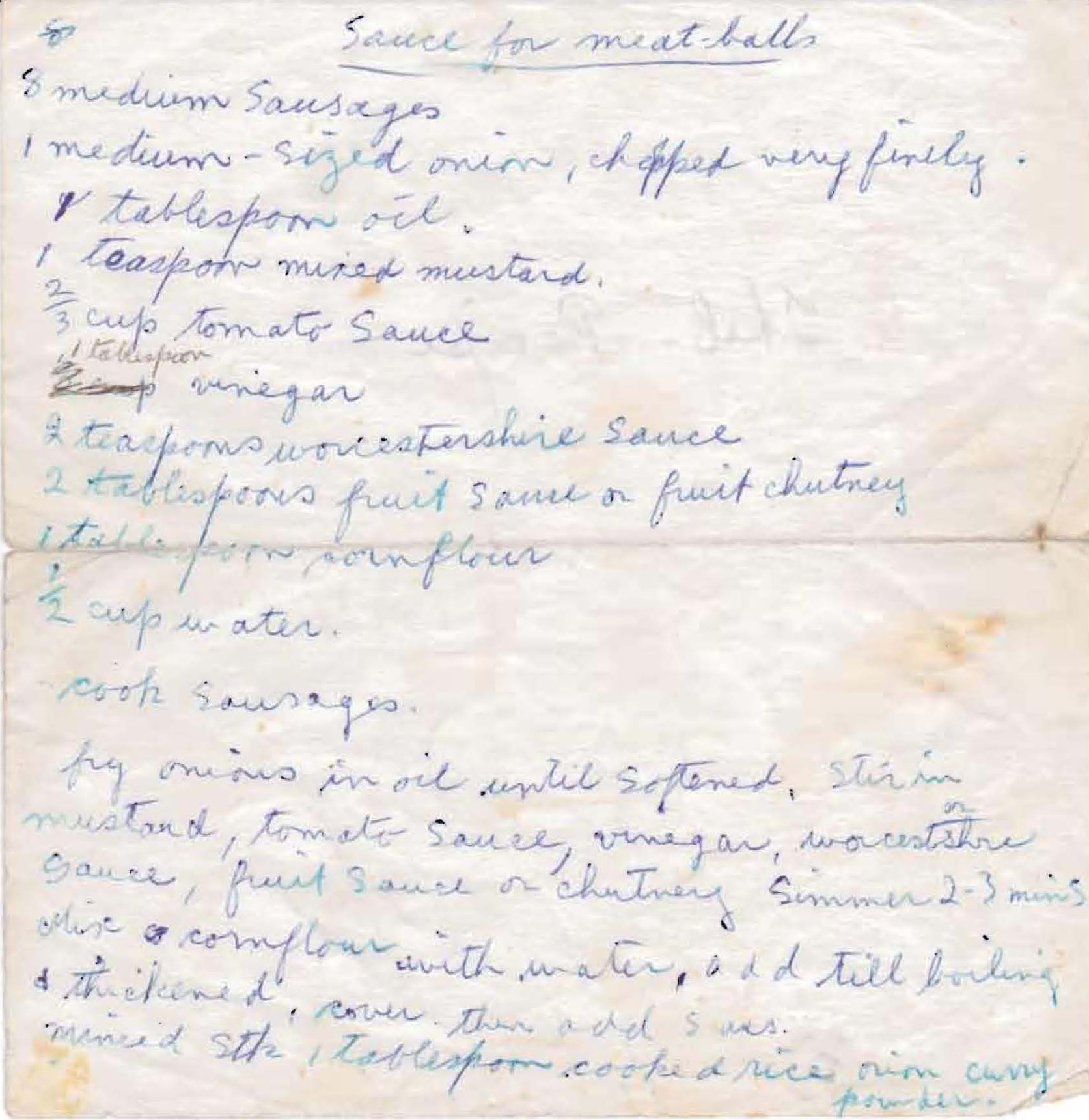 Cook sausages or meatballs. Fry onions in oil until softened, stir in mustard, tomato sauce, vinegar, worcestershire sauce, fruit sauce or chutney. Simmer 2-3 minutes. Mix cornflour with water, add till boiling and thickened, cover then add sausages or meatballs. Meatball recipe: minced steak, 1 tablespoon cooked rice, onion, curry powder.